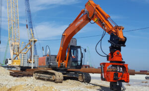 Это не просто навесное оборудование, Это многофункциональное устройство предназначенное не только для забивки шпунта и погружения свай, но так же имеет возможность присоединения трамбовочной площадки что дает возможность производить уплотнения грунта. Удлинители рукояти экскаватора дают возможность погружать свайные элементы длиной до 12 метров.